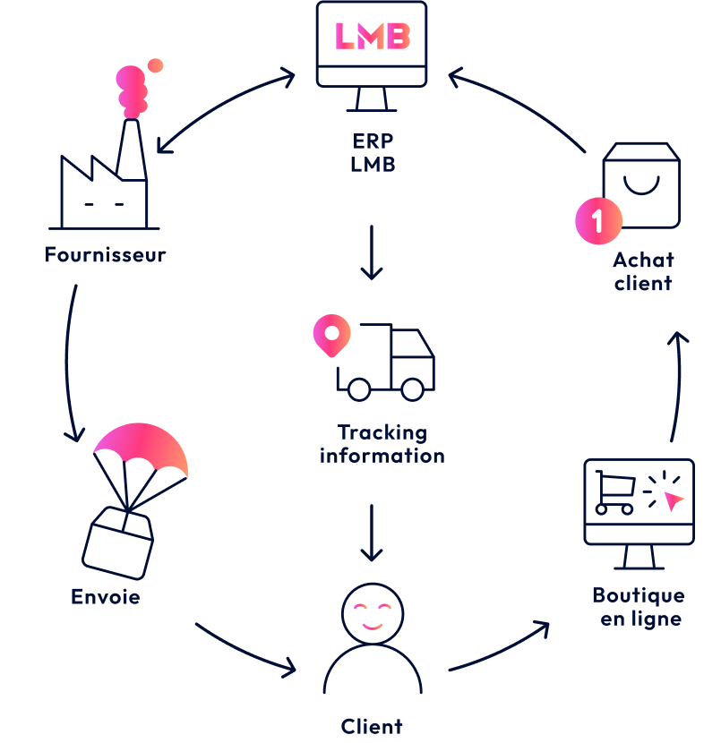 Nos connecteurs e-commerce recopient les coordonnées clients et les commandes dans votre système de gestion LMB, puis informent vos clients en temps réel de suivi de leurs commandes.