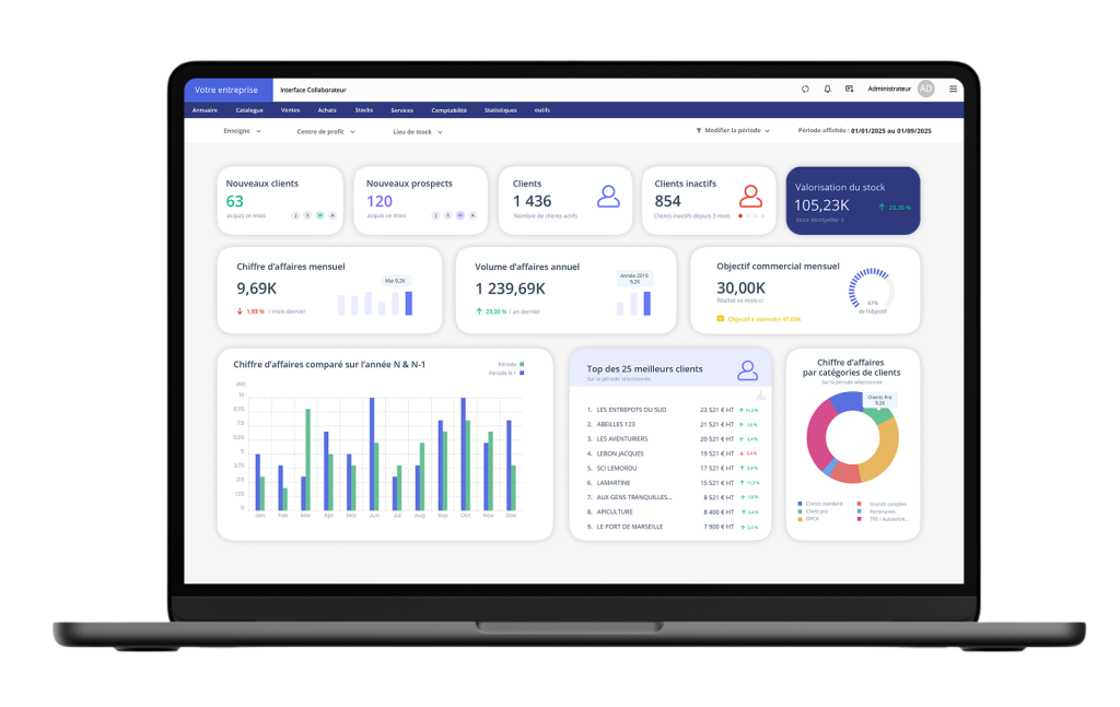 Suivez l’évolution de votre activité et visualisez vos performances, vos marges et vos chiffres clés à tout moment, par produit, canal ou client. Prenez les bonnes décisions, sans attendre la fin du mois.