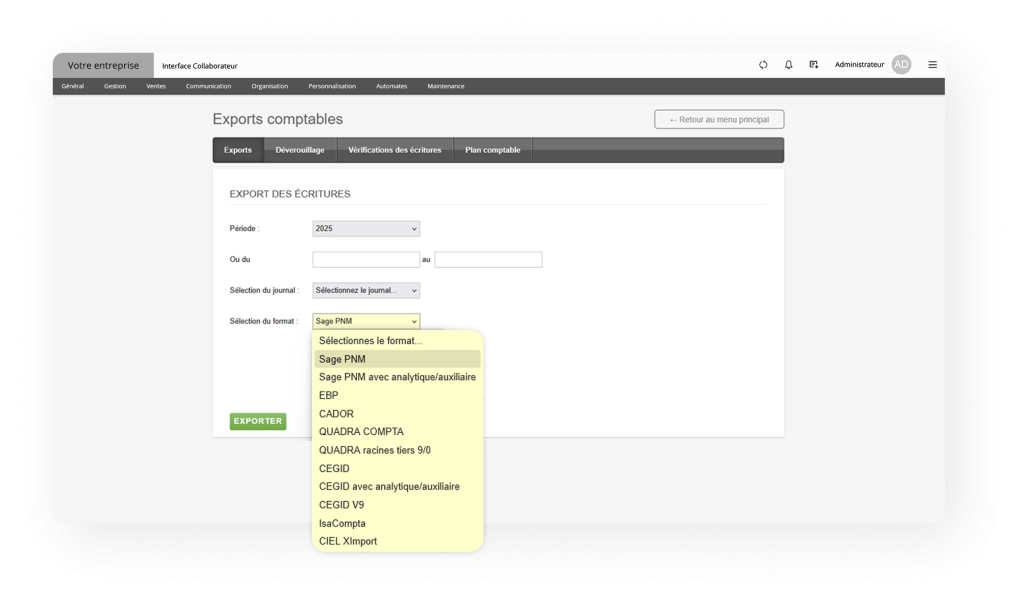 Export comptable : Générez des fichiers compatibles avec les principaux logiciels de votre expert-comptable (Sage, Cegid, etc.) en quelques clics.